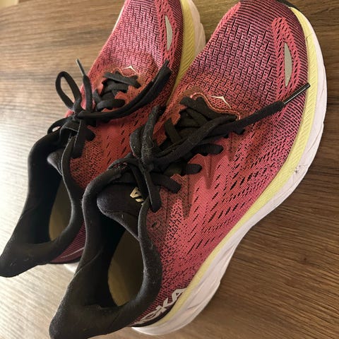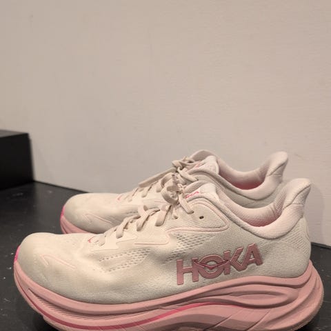 Hoka Clifton 6 sneakers joggesko i størrelse 41. Skoene er svarte med hvit såle og har snøring. Designet for løping og hverdagsbruk med fokus på komfort og demping. Godt brukt, mye bruk igjen.