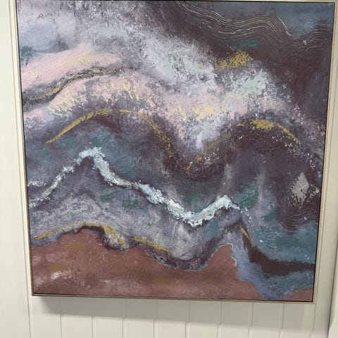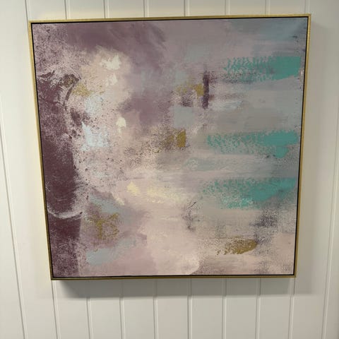 Stilrent og moderne abstrakt kunstverk med harmoniske overganger i grå-, sand- og duse grønntoner, kombinert med subtile innslag av gull. Den horisontale linjen i midten gir ro og balanse, og skaper et elegant, nesten landskapsaktig uttrykk.