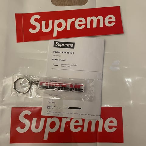 Supreme klistremerker med rød bakgrunn og hvit tekst. Flere stk. Kan brukes til dekorasjon på ulike flater.