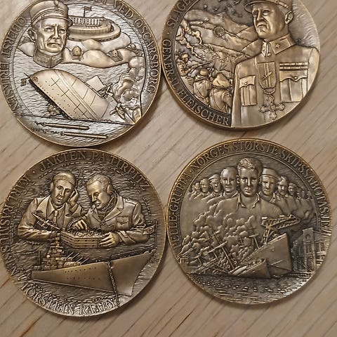 Diameteren er på imponerende 61 mm patinert bronsemedalje og vekten er på over 100 gram.