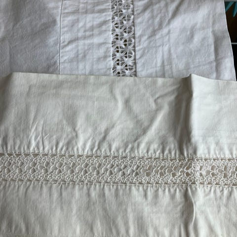 Eldre overlaken, ligget pakket bort - så gulnet litt, kan kokes.