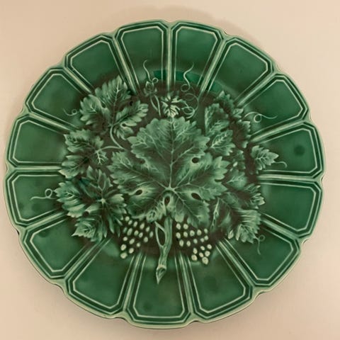 Arol Halden keramisk fat med en diameter på 36 cm. Fatet har en grønn farge og dekorative mønstre med blomster og bølgende detaljer. Passer til dekorasjon eller servering.