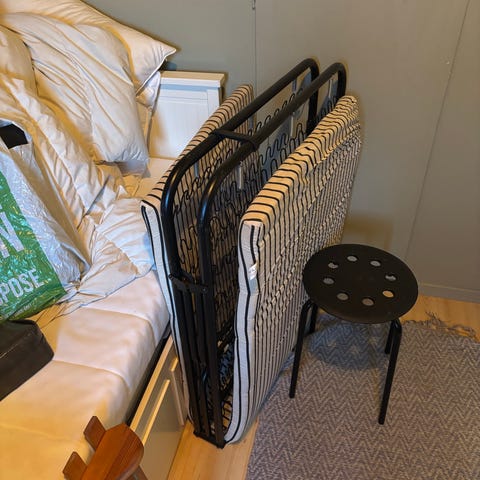 Enkel Seng som kan slås ut til dobbel seng . Lengde 200cm bredde 75 (150). Brukt på et gjesteværelse