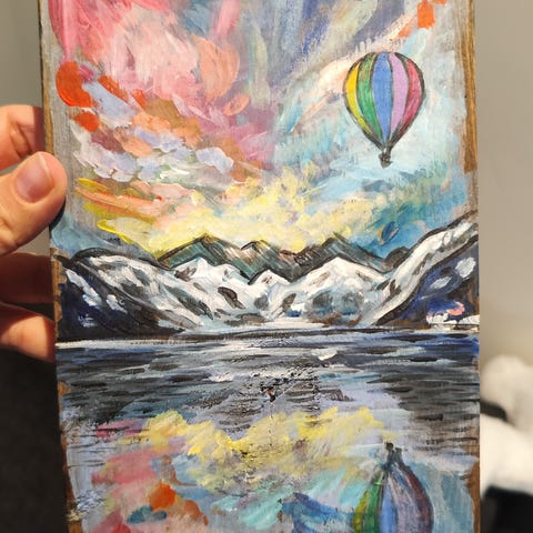 To malerier på lerret med abstrakte motiver i blåtoner. Passer til veggdekorasjon. Hvert enkelt lerret har mål 102 x 30 cm. Må hentes