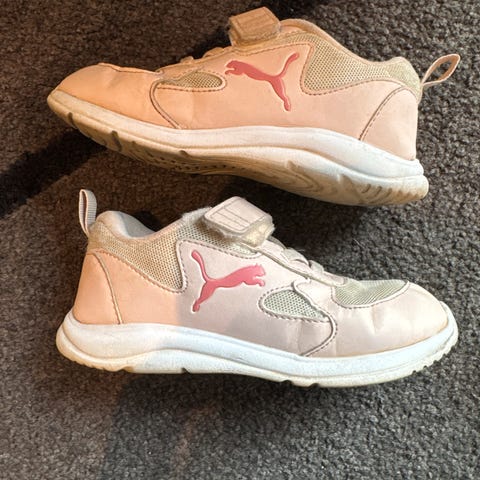 Puma barnesko for jente i størrelse 27. Skoene har en rosa farge og er laget med materialer som gir komfort og støtte. Egnet for daglig bruk og aktiviteter.