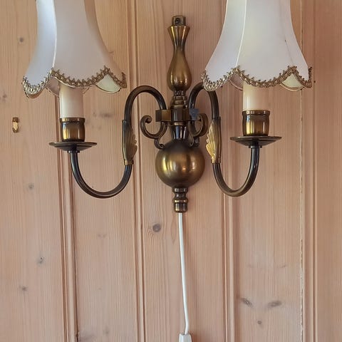 Vintage vegglamper – messing, krystall og stoffskjermer