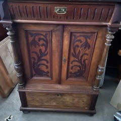Gammelt luta skap med dør og to skuffer. Ca. 150 år gammelt. Mangler glass i døra.