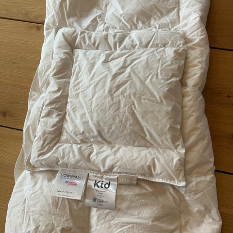Dundyner og puter ink trekk. En tykkere dyne og en noe tynnere. Begge i dun. En høy pute og en lav (i filt). To sengesett inkludert og et ekstra dynetrekk. Selges samlet.
