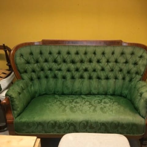 En toseter sofa og to lenestoler i nydelig stoff. De er store og herskapelige, og man kan virkelig krype opp i og finne gode sitte- og liggestillinger. Det følger med to matchende puter, hvor den ene må sys litt i ene kanten. Det er kjøpt nye dun og fjærileggsputer i putene.