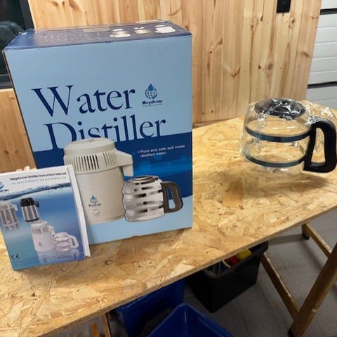Megahome vannrenser og vanndestillasjonsapparat med kapasitet på 4 liter. Brukes til destillering av vann for å fjerne urenheter, mikroplast og evighetskjemikaleier. Inkluderer tilbehør for måling og kontroll av destillasjonsprosessen.