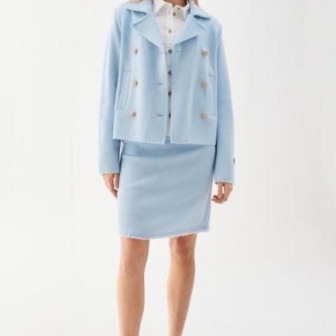 Jakken har flerfarget mønster i grått og sort og er laget av ull.