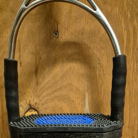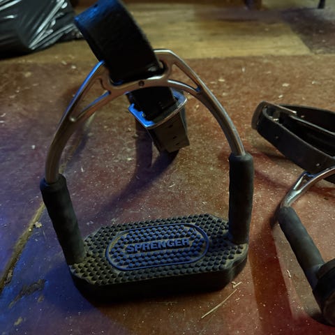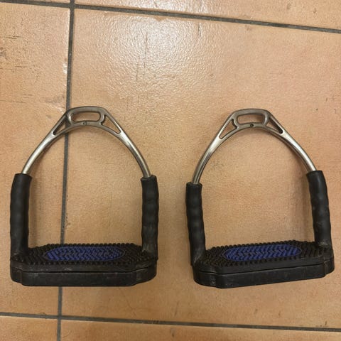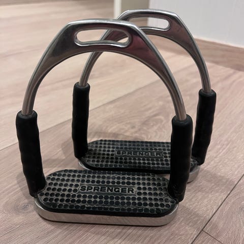 Pent brukt Sprenger stigbøyler med gummigrep for bedre fotfeste. Stigbøylene har en bredde på ca. 11,5 cm.