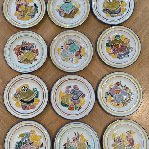 Helt og uskadet kaffeservise fra 1918, håndmalt av Theodor Peter Nikolai Friestad for Egersunds Fayancefabrik. Selges samlet.