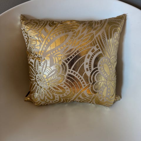 Pute i jordtoner med innslag av lyseblått på en side. Vakkert mykt smykke i hjemmet. Innepute i dun og fjær følger med.