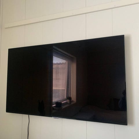 Størrelsen er 46 tommer. TVen må henges opp, vegghenger medfølger.