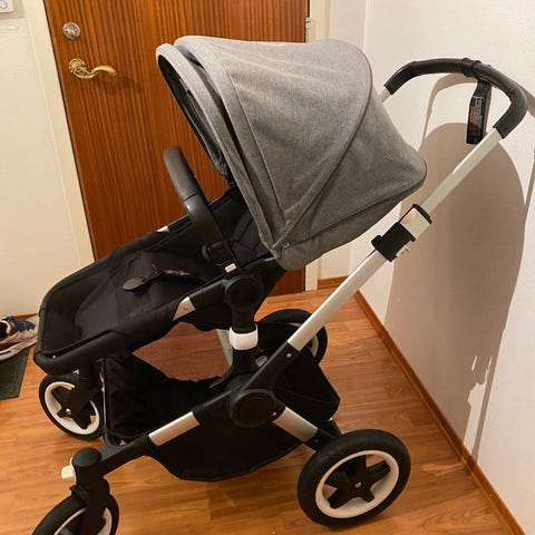 Vognen er i god stand, noen små bruksmerker her og der. Det følger med sittedel og liggedel. Bugaboo regntrekk, myggnetting og Bugaboo organiser følger med.