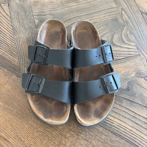 Birkenstock sandaler i størrelse 37, svart farge. Sandalene har justerbar stropp og såle med karakteristisk mønster for grep og komfort.