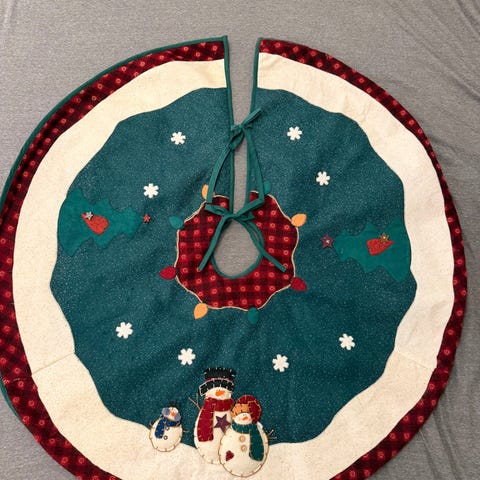 Juletreteppe med hvit fuskepels, ca 90 cm i diameter. Husker ikke hvor det er kjøpt.