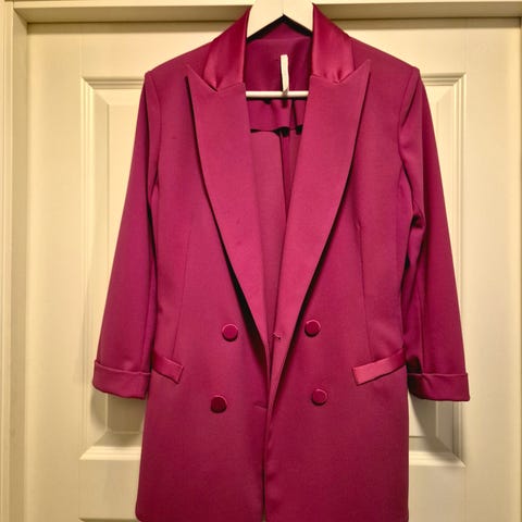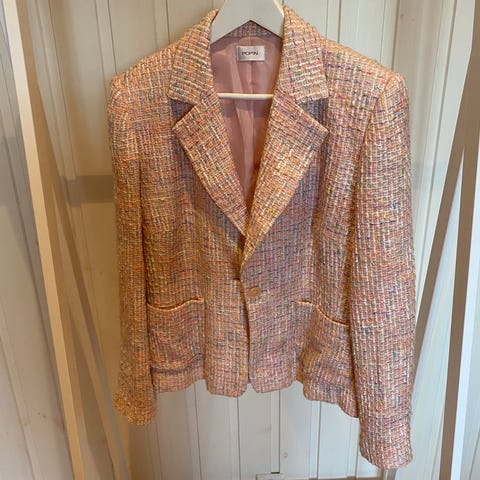 Lang blazer fra popin. Vintage modell som er flere år gammel. Lite brukt,men like aktuell i dag. Kan brukes alene med høye støvletter,eller til bukse,fin kjole. Må renses!