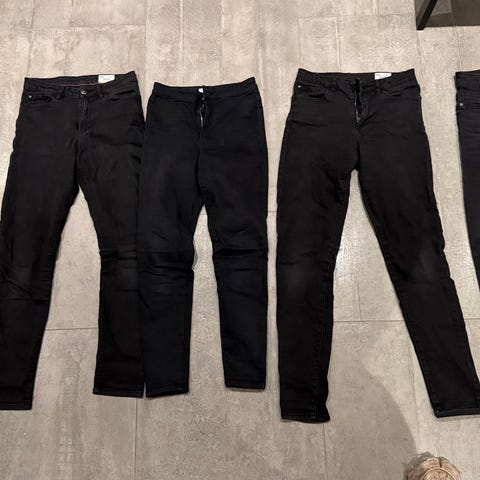 5 pent brukte blå jeans/dongeri brukt av jente i str 152, XS, S og 36. Bildene av enkelt-bukser er fra venstre til høyre i samlebildet først.