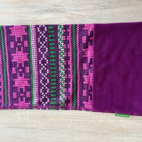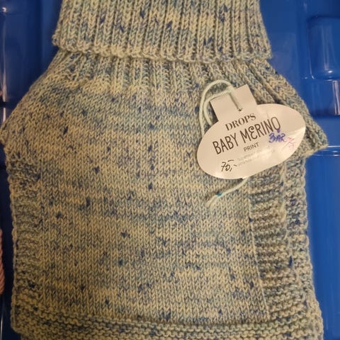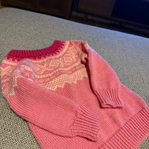 Nydelig hjemmestrikket genser i rosa, blå og hvitt.