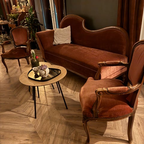 Skapsofa og 6 spisestoler fra ca begynnelsen av 1900-tallet (usikkert prod.år).