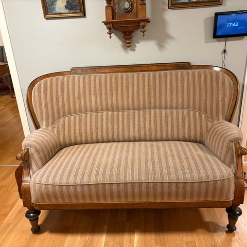 Sofaen er muligens en videreføring av Biedermeyer-stilen og har skap på sidene (brukes som barskap!) og har fin ornamentikk.
