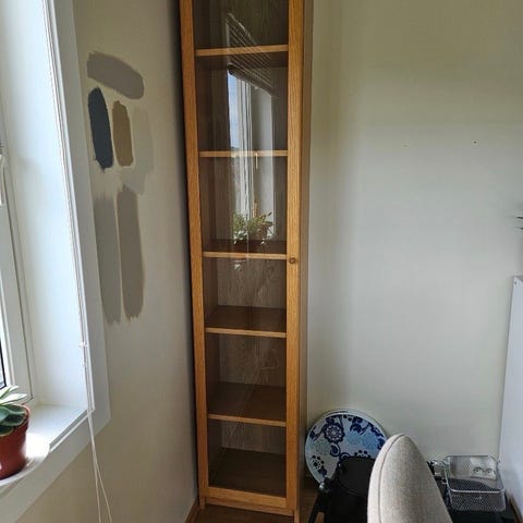 Vitrineskap malt i svart, med lys. Ene skuffen fungerer litt dårlig, og et par steder malingen er litt slitt, ellers er det helt og i orden