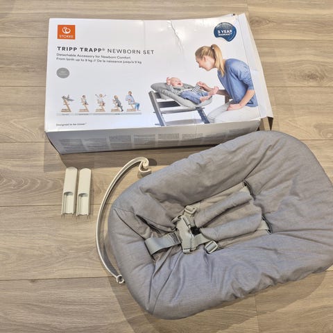 Selger babysete til Tripp Trapp-stol. (Stolen er ikke til salgs) Praktisk til baby de første månedene så de kan være ved bordet. Stropper for sikring av babyen. Festes enkelt og sikkert til stolen. Nyvasket, helt og fint.