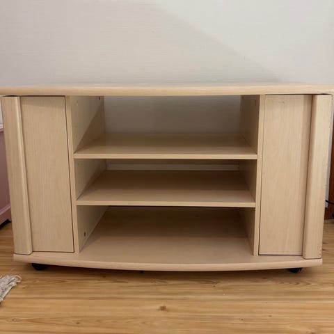 Pent brukt tv benk. Topplate kan vris. Med glassdør og hjul
