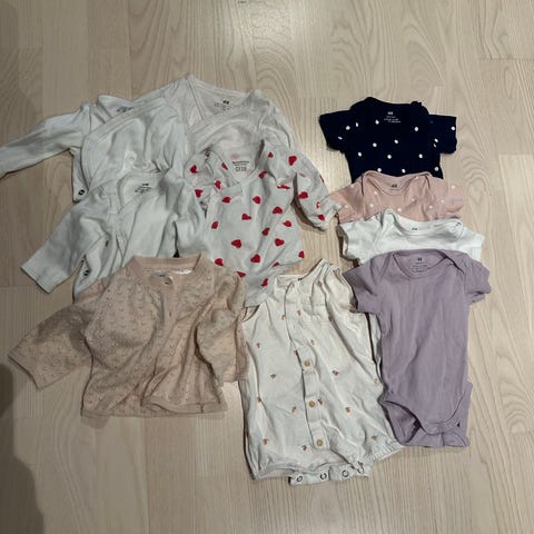 Name it, H&M,Newbie barneklær i størrelse 56 og noen 50 for jente. Inkluderer ulike plagg som heldresser, bukser, gensere og jakker i forskjellige farger og mønstre. Materialene varierer og inkluderer myke tekstiler egnet for små barn. Pent brukt.