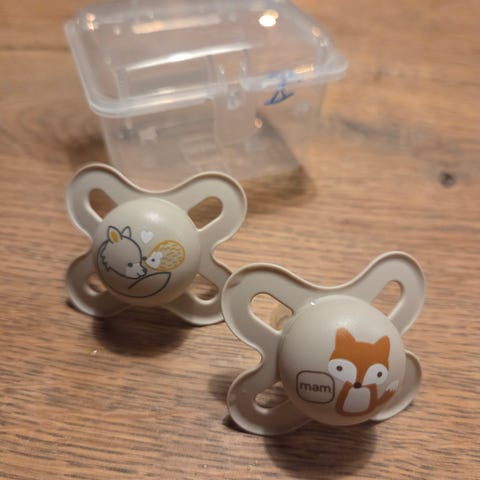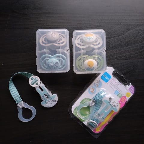 Tre stk ubrukte smokker fra MAM. Smokk med motiv var med i babypakke fra apotek 1 og de to rosa er kjøpt på barnas hus. Ene rosa smokken og den med motiv er 0-2mnd og den andre rosa smokken er 0mnd/nyfødt.