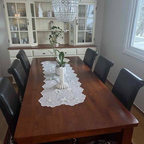Diameter på bordet er 150 cm. Som ny- ikke synlig brukt. Vurderes solgt pga flytting. Jeg selger ikke under annonsert pris, så vennligst ingen forespørsler om "siste pris".