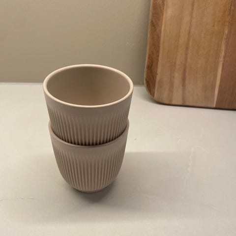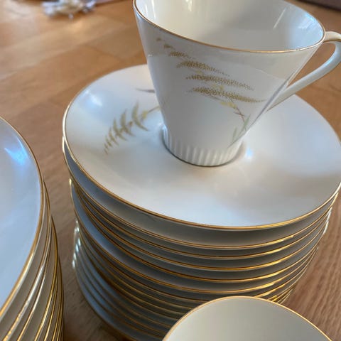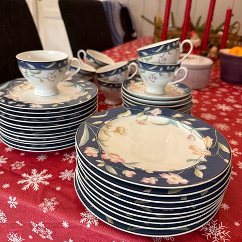 Det er 2. sortering, et av fatene har et lite skår i kanten - se bilde. 5 av fatene er litt mer buet enn resterende pga at det er 2. sortering.
