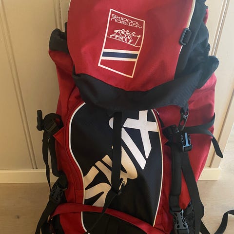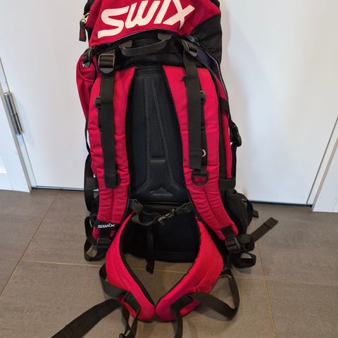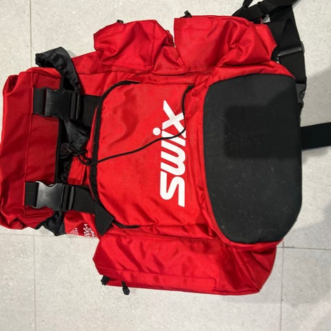 Swix Rucksack ryggsekk i rød og svart farge. Utstyrt med justerbare stropper og flere lommer for oppbevaring. Polstret ryggstøtte og hoftebelte for komfort ved bæring. Den har også regntrekk. Litt usikker på hvor mange liter den er, men tipper 35-40 liter