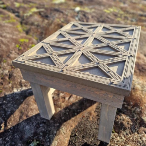Solid bord med material tykkelse på 75 mm ca 5 år siden jeg laget det. Beiset og lakket.