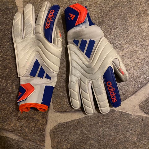 Adidas FS replique keeperhansker i blå farge. Hanskene har grepflate i hvitt materiale og borrelåsstramming rundt håndleddet for bedre passform.