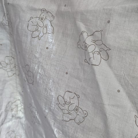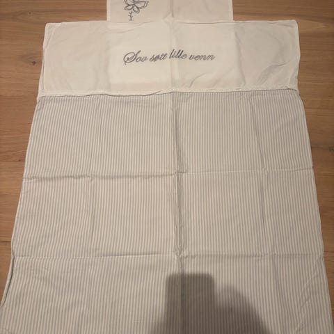 Nesten ikke brukt. Antar at målet er 80x100. Passer til sprinkelseng. Dynetrekk og putevar i bomull.