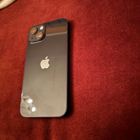 Apple iPhone 13 rosa med 128 GB lagringskapasitet. En smarttelefon med skjerm som viser ulike apper. Bakdekselet har synlige skader og sprekker, spesielt nederst for dem som er interesserte i reparasjoner.