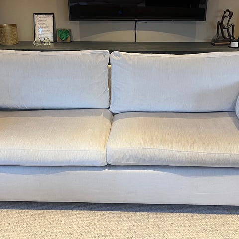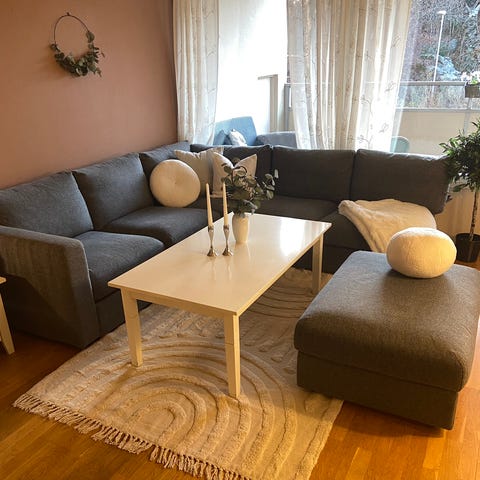 Her får du mye sofa for pengene! Vi har kjøpt ny sofa og selger derfor vår Vimle sofa fra IKEA. Vi har alltid vasket trekkene i vaskemaskin men i sommer renset vi den med maskin og noen av trekkene ble noe slitt av dette. Sofaen slik den står i dag med beige trekk bør nok kjøpes nytt dersom man ønsker den lys. Se slitasje etter rensemaskin. Har ekstra trekk i blått, passer ikke 100 % på puffen, se bilde av blått trekk. Har også 2 stk nakkeputer med beige trekk som kan følge med.