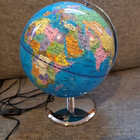 Globusen er i god stand, dekorativ og gir fin dempet belysning. Sokkel og meridianbue i plast, med forstørrelsesglass. Sort ledning med bryter. Omkrets er ca 95 cm/(diam.30), høyde 42 cm.