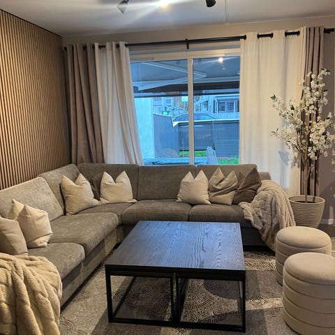 Pent brukt hjørnesofa. 225 cm kortsiden, 266 cm langside, 85 cm høy (toppen av putene), 95 cm dybde. Svarte metallben. Putene kan tas ut og sofaen deles i to. Vaskbare trekk.