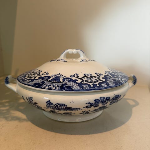 Kinesisk porselensskål med lokk i blå og hvit farge. Laget av porselen, egnet for servering og oppbevaring av mat.