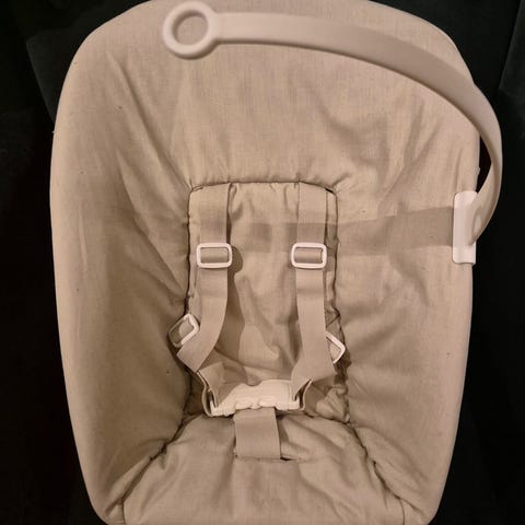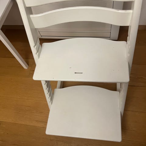 Stokke høy barnestol i tre og hvit plast. Justerbar sitte- og fotplate, designet for barn. Brukt til 1 barn. Noen svake «skapemerker» noen plasser.