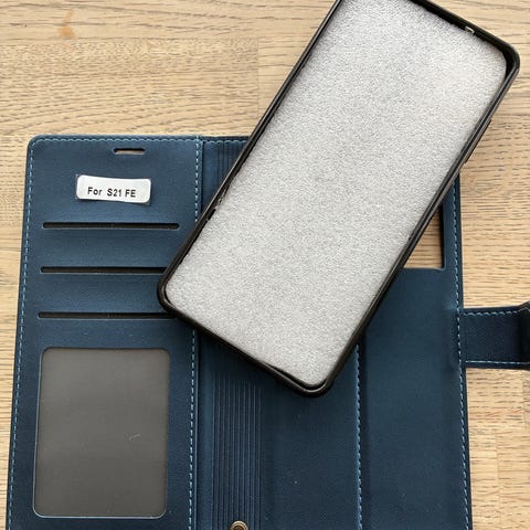 Samsung telefondeksel. Dekselet har en lys brun farge og inkluderer en lomme for kort eller små gjenstander. Laget for å beskytte telefonen mot skader.