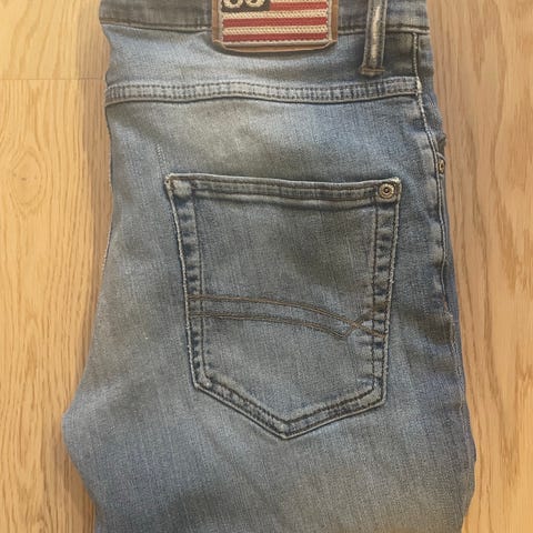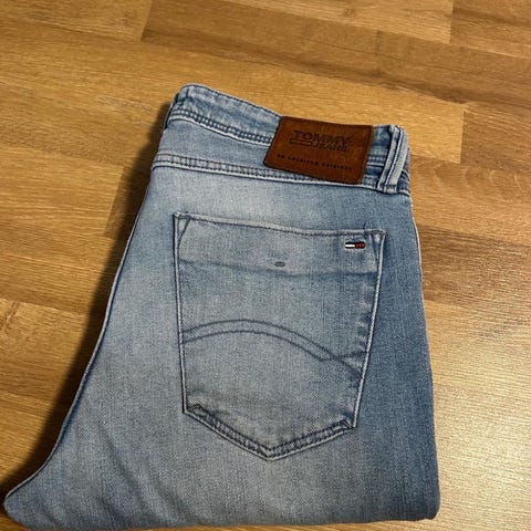 Tommy Hilfiger Jeans i Blå bomull, Størrelse W 32 og L 34, . Jeansene har klassisk design med lommer foran og bak, og merkets logo er synlig på baklommen og på Lærmerket i livet.