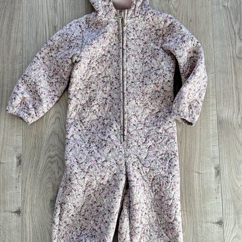 Wheat barneklær heldress i størrelse 74, designet for jente. Dressen har flerfarget mønster og er laget av polyester. Egnet for utendørs bruk med hette og glidelås foran.