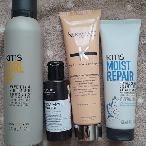 KMS Moist Repair hårpleiesett med 3 deler, inkludert treatment, shampoo og conditioner. Shampoo er åpnet og brukt 2 ganger. Resten er uåpnet.