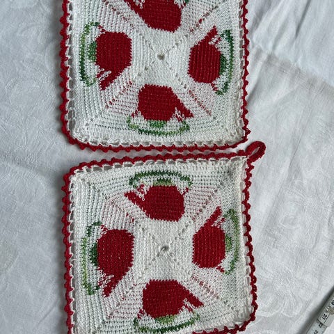 2 stk Retro doble grytekluter i bomull. Str H inkl oppheng 28 cm, B 24 cm. Heklet på slutten av 70-tallet. Bomull leder ikke varme, så det skal mye til å brenne seg. Fremstår som nye. Selger samlet. Sendes mot porto.