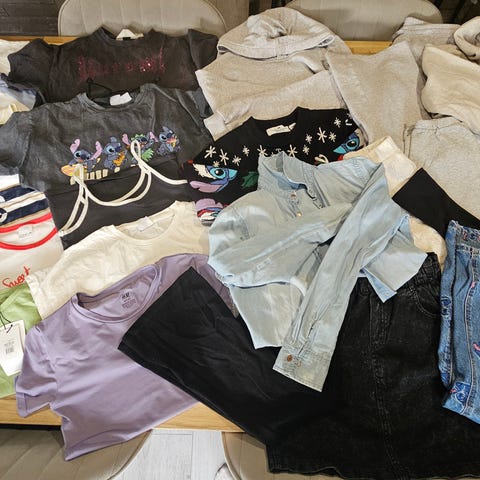 To søple sekker med barneklær for jente i størrelse 146-164 med flerfarget design. Inneholder ulike plagg egnet for barn i denne aldersgruppen. Noe er str XS’ også. Klærne er fra forskjellig butikker. Må hentes.